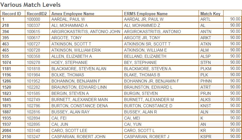 Figure 6 shows twenty records of the 90% match results and Figure 7 shows twenty records of the 85% match results. By using my brain as a rapid comparison tool, I determined that the match results are fairly solid through 90%. ย The results are very reliable. Once you go below 90%, more mis-matched names occur as shown in Figure 7.