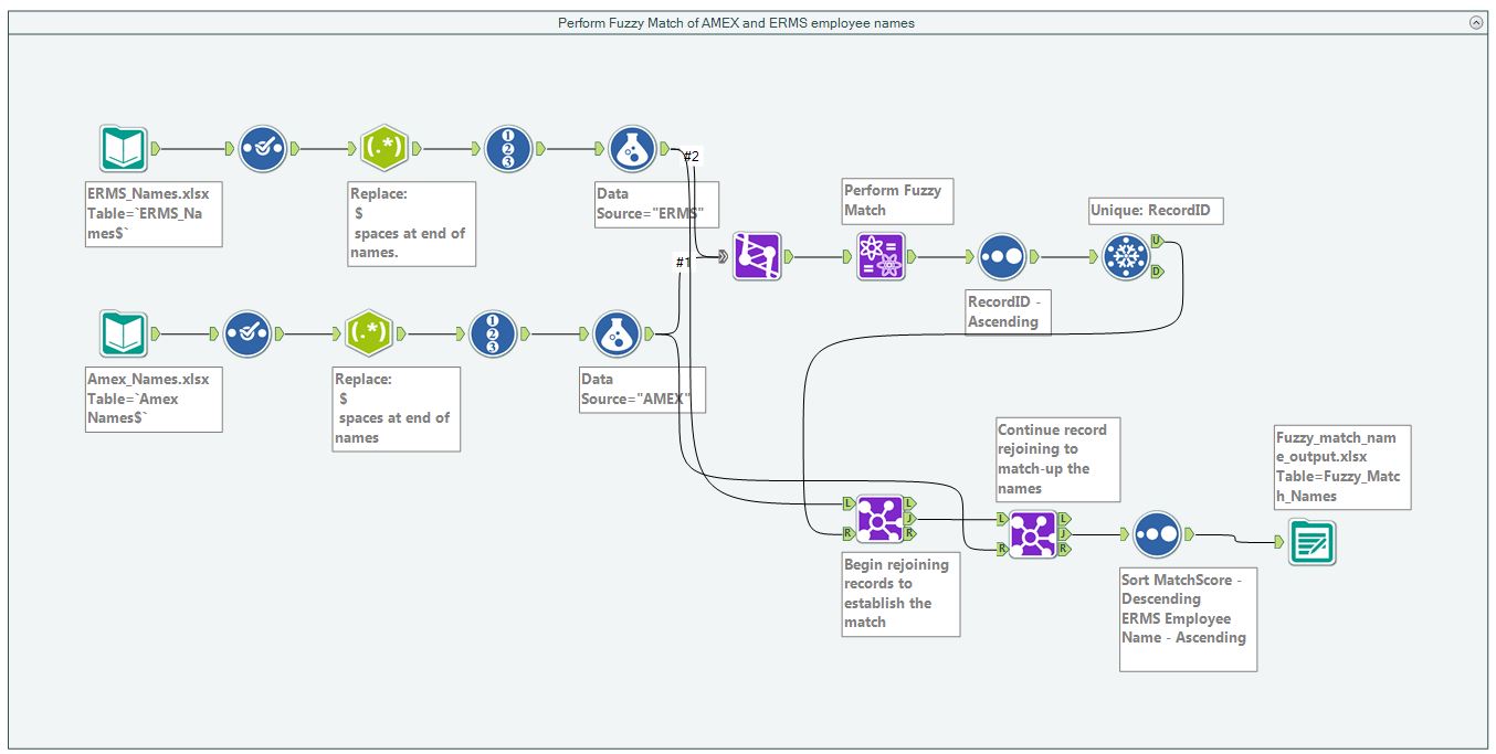 I reformatted the employee name databases so that both databases had the same comma-delimited format. Once I had these two files ready, I built an Alteryx fuzzy match workflow by closely following this excellent 10-minute Alteryx training videoย which was incredibly valuable to my use case.