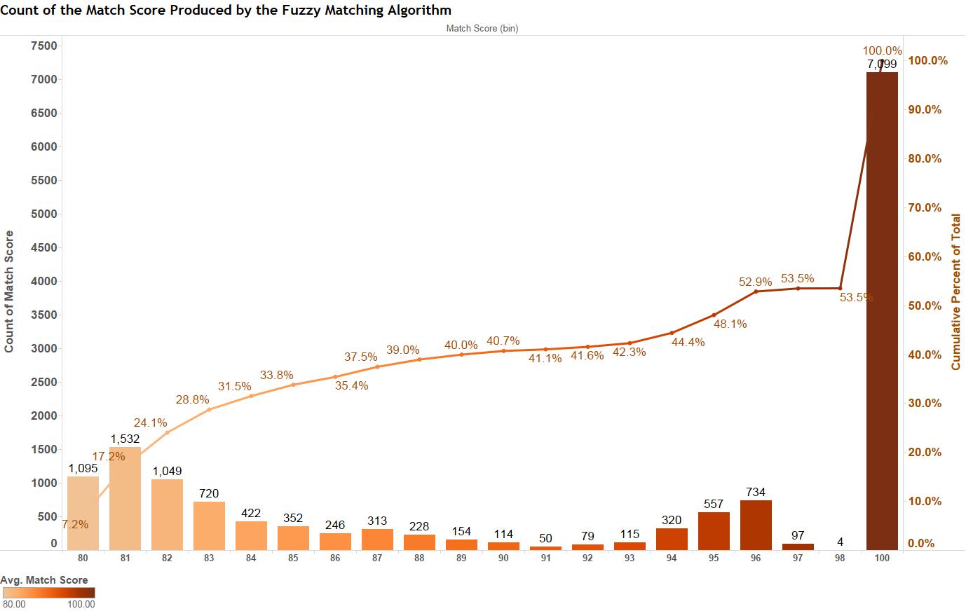 From the two lists, the fuzzy match tool was able to match 15,280 names at a level of 80% or above (out of a theoretical maximum of 16,057 names, or 95%). What I am going to show is a detailed assessment of the value of these matches.