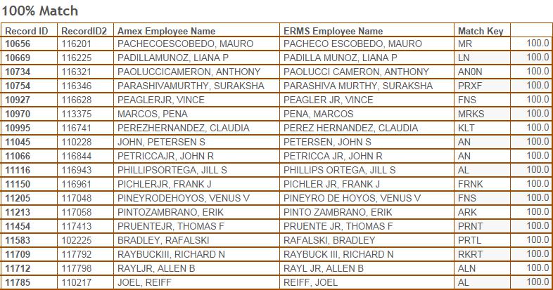 My objective is to match records based on the employee name (and another field). To begin the task, I needed to see if I could match employee names.