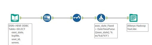 The primary issue we had when working with Hadoop data in Tableau is that Tableau is very sensitive to the format of the date fields. There were a couple of different date fields in the original table which caused Tableau some difficulty. We think the newest dateparse function (Tableau 10.3) will take care of that problem, although this issue was handled by Alteryx with only warning messages given (see below). Note that version 10.3 was not available when we did this work.